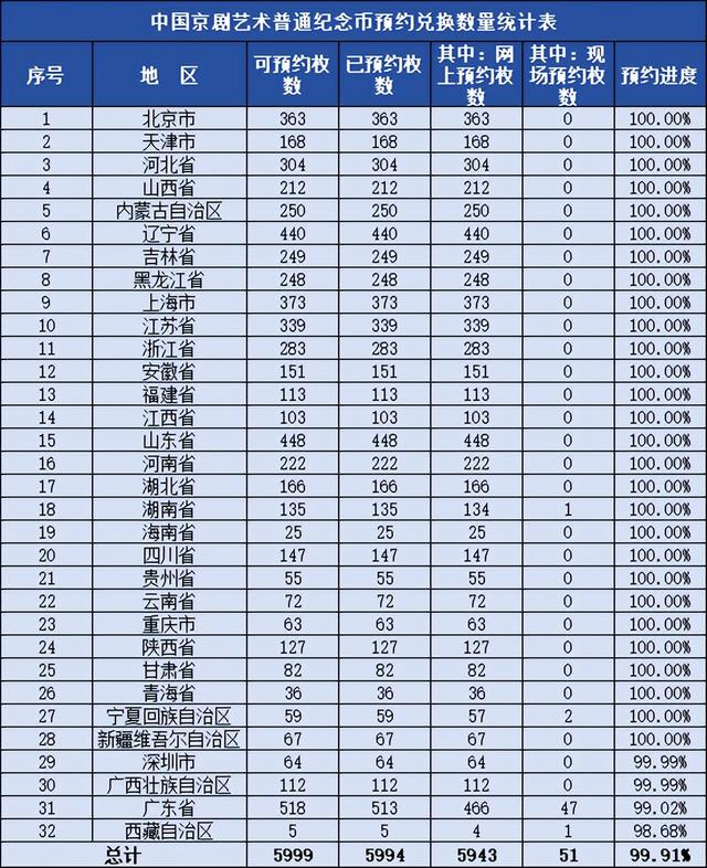 百科网将预约率从高到低进行排列。 预约率最低的,都有98.68%,还是因为有线下额度,拖累了一定预约进度。 不知道各位是否有约到呢?有约到了几枚。 还有1次预约机会值得重视的是,本次京剧币将在预约兑换结束后,直接开启余量兑换。 可能有朋友会不屑一顾,认为如此火热的京剧币,不会有太多人弃兑。