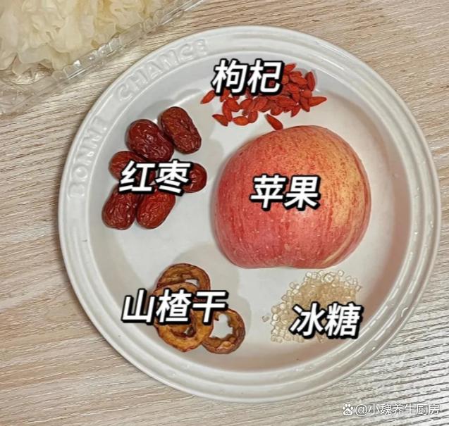 一晃眼就到了深秋,秋季到冬季过渡的阶段,天气出现很大的转折,早晚的温差会很大,人的情绪非常不好,身体非常困乏无论,气色还非常差,总是觉得干活没有力气,感受嗓子不舒服,抵抗力很低下。到了40岁以上,每天要操心很多事情,不仅仅要还房贷车贷,还要抵抗岁月的摧残,女性经常去美容院,但是效果都不太好,不如多吃一些水果,对皮肤有好处,也不会长胖。  我们家每周都会囤积很多水果,比如说苹果,柚子和香蕉,每到周末都吃不完,我们就会制作成各种水果羹汤,孩子才会吃。今天准备用苹果,山楂,红枣和银耳制作一款水果羹——苹果山楂红枣银耳羹,经过简单的制作,汤品非常甘甜,营养全面,老少皆宜。想必很多人第一次听说这款苹果山楂红枣银耳羹,到底要如何制作呢?快一点学起来吧。苹果和它是绝配,秋季要多喝它,补血养颜,营养易消化,好处多多。 【苹果山楂红枣银耳羹的制作技巧】 准备一些食材:挑选1-2个大苹果(苹果是一种全年都能够吃到的水果,水果的光照非常充足,甜度非常高,富含大量果酸,维生素和水分,秋冬季节要多吃,补充许多能量,加速肠道的蠕动,对肌肤健康有好处),干山楂25克左右,若干个大红枣,银耳一朵,少许枸杞子,冷水和温水,冰糖少许,食盐少许,其他调味品。具体制作顺序: 第一步:提前选购好苹果,山楂,红枣和银耳等食材,山楂用流水冲洗干净,枸杞子也冲洗掉表面的灰尘。第二步:几个红枣洗干净,去核切成小块,将银耳放在碗中,加上少许温水泡发,泡软后去掉根部,洗净切碎成细末,最后控干表面的水分。 第三步:将炖锅洗干净,加上适量清水,放入一些银耳碎,大火煮开,然后中小火煮15分钟左右,中途可以用汤勺搅动,让银耳快速出胶。第四步:苹果的果皮有一些脏东西,用食盐反复涂抹,反复用清水冲洗,洗净去掉里面的果核,切成若干块状,备用。 第五步:锅中放入一些红枣和山楂,继续炖煮一小会儿,银耳煮至浓稠,放入切好的苹果(也可以去掉外皮,就可以省略去皮的这一步),继续炖煮15分钟。 第六步:最后放入一些冰糖,放入一些枸杞子,一起炖煮一会儿,让水果的营养煮出来,也不会煮太烂。