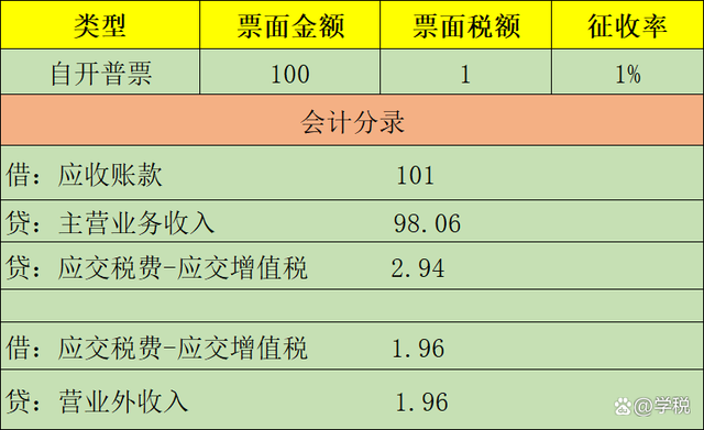 根据财政部 税务总局公告2023年第1号,2023年小规模纳税人适用3%业务的应税收入,减按1%征收增值税。那么,做账是不是需要先按3%价税分离,然后2%计入营业外收入呢?今天我们就给大家简单聊一下这个问题。 有不少认为,3%减按1%这个优惠政策之下,做账的时候是需要先按3%进行价税分离,然后2%体现为企业收入的。简单来说,逻辑就是:先计提3%增值税,然后把2%计入其他收益。 比如学税公司,是一家小规模纳税人公司,在2023年1-3月开了征收率为1%的普票价税合计101万。那么很多人认为做账应该是: