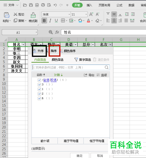 7. 我们可以选中首行,使用筛选功能,可以使用升序也可以使用降序。