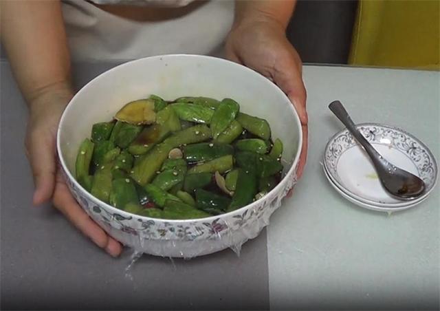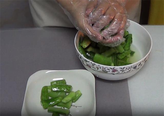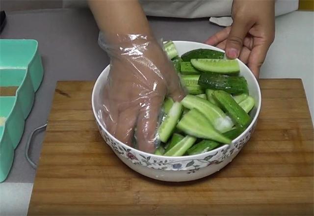 2.黄瓜杀好水之后,用手再攥一下,也可以用重物压一下,尽量去除多余的水分。