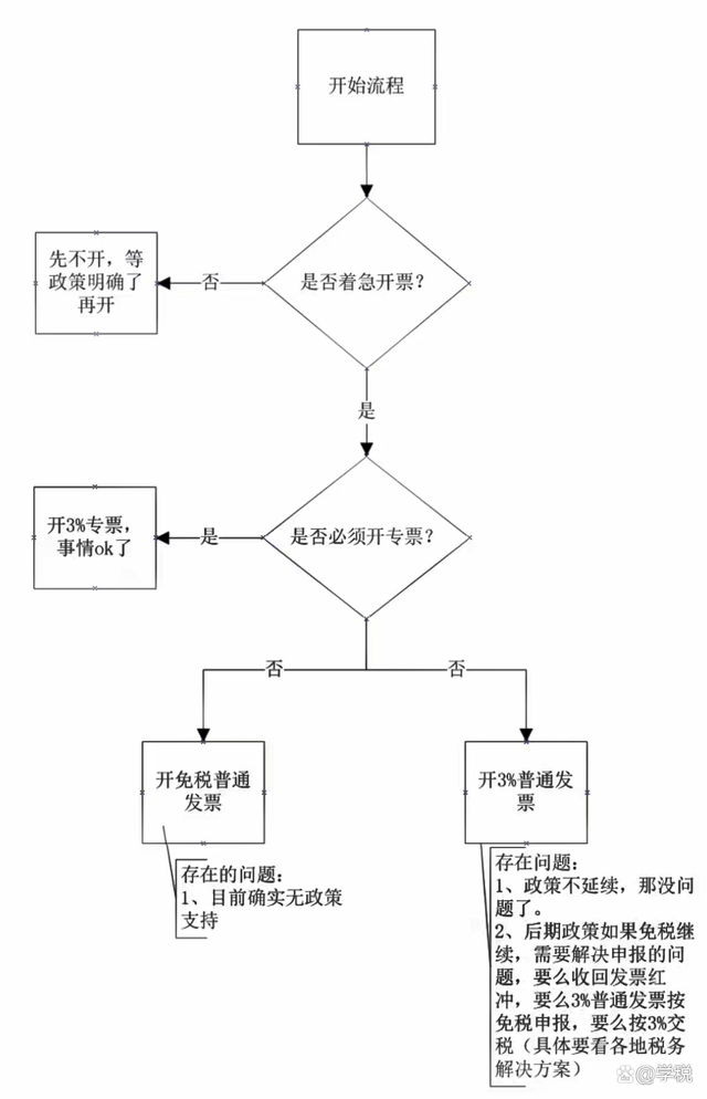 第一,如果免税优惠政策继续延续:开了免税的发票,自然没有什么问题。那开了3%的普票如何处理呢?能收回自然最好,不能收回的话,先前也有3%普票按免税申报的地方税局执行口径。 第二,如果免税优惠政策不延续了:现在开了3%普通发票,自然没什么问题。那开了免税的发票如何处理呢?也会涉及换票和申报的问题,能退票、换票自然最好,不能换票退票的话,直接按征税申报,也是能实现的。 当然有的地方直接没发开出免税的发票,那处理也就比较简单了,直接按3%开即可。但有的地方升级开票软件后,是可以开出免税发票的,虽然现在政策依据上不足,但是如何开票,上面我们也做了较为详细的说明。