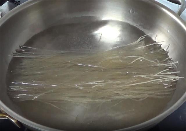 4.煮粉丝时,水开后再煮三分钟就差不多了,然后把粉丝捞出,放入有底料的碗中,再把煮粉丝的水倒入碗中,然后搅拌均匀。