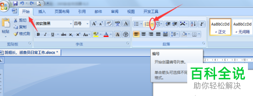2. 第二步,点击开始选项,然后再点击二级菜单中编号右侧的小三角图标。