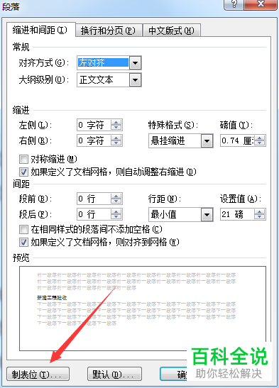 5.第五步,打开段落设置窗口,点击下方的制表位选项。