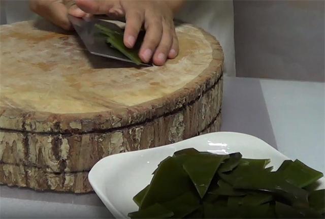 2.我们把海带先改下刀切成小块,这里一定要选这种厚的海带根,这样做好了才好吃,切好之后装入盘中。