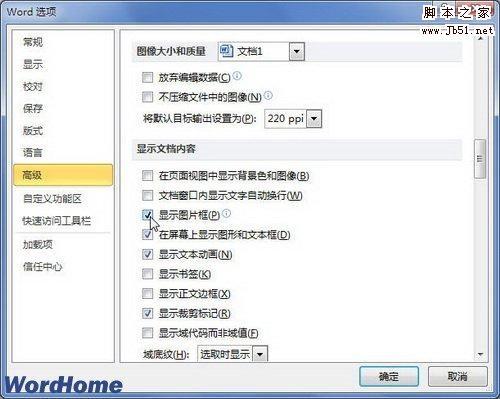 第2步,打开“Word选项”对话框,切换到“高级”选项卡。在“显示文档内容”区域选中“显示图片框”复选框,并单击“确定”按钮,如图2012011502所示。