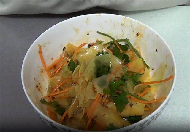 3.捞出后立刻放入冷水中,控干水分的土豆片加入香菜段和胡萝卜,再把葱蒜末放进去,然后加少量的糖,适量的盐,少量味精,少量的香油,然后加入多一点的辣椒油,一勺素蚝油,最后加一勺白醋,然后用筷子拌匀。(www.ws46.coM)