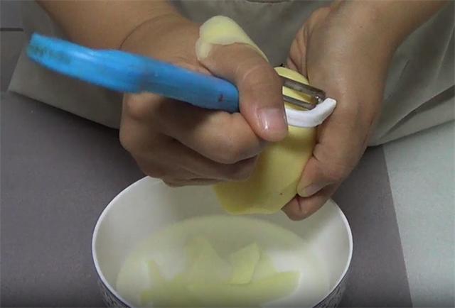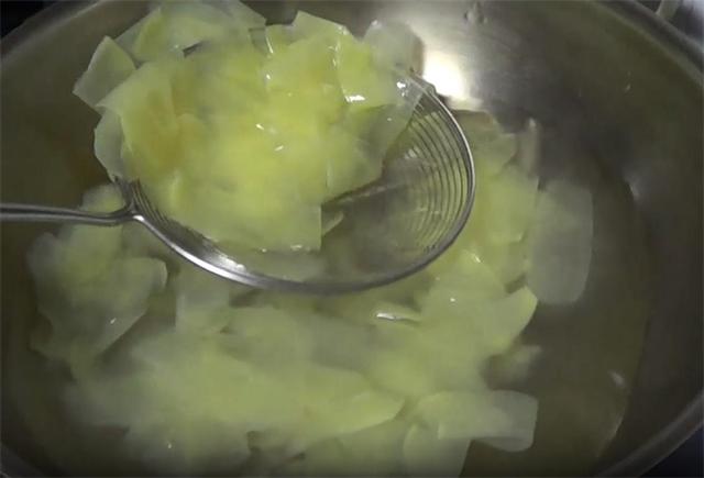 2.削好之后起锅烧水,水开后加少量的白醋,下入土豆片,因为土豆片比较薄,所以煮的时间不能太久,变色就要捞出。