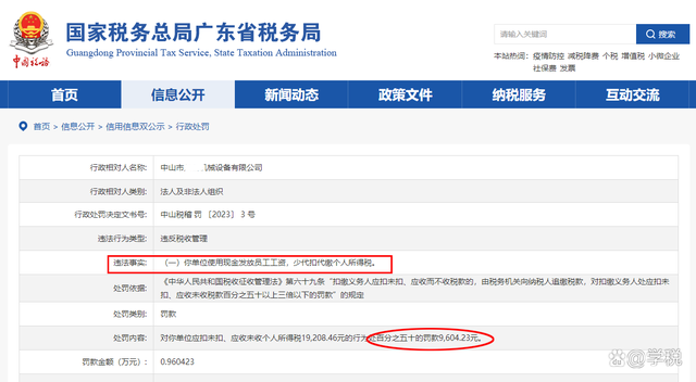 据中山税稽罚〔2023〕3号,中山市某机械设备有限公司因使用现金发放员工工资,少代扣代缴个人所得税被税务局处罚,处罚内容为:对该公司应扣未扣、应收未收个税处50%罚款,金额为9604.23元。 为了避免造成误解并帮大家透彻理解,我们有必要对这个案例解释说明一下: 1、案例中企业用现金发工资并不违规也不违法,企业违法的地方是:没有代扣代缴个税。无论采用什么样的方式发工资,不代扣代缴个税,查到都会被罚。 2、实务中,我们不建议企业用现金给员工发工资,更不建议企业经常用现金发工资。主要原因是:这样操作可能会引起税务局的重点关注,增加企业的涉税风险。案例中一万多的税款都会被查到,就是一个侧面的说明。 3、如果企业想要通过现金发工资的方式,进行规避个税、隐匿收入,或是偷逃税款等行为,我奉劝还是不要有了。当下的稽查环境下,这样操作真的会得不偿失。 4、处理员工工资、福利、补贴等事宜的时候,一定多加考虑个税问题,该代扣代缴的一定要代扣代缴。因为根据征管法规定,作为扣缴义务人应扣而未扣、应收而不收税款的,会有相关税款0.5-3倍之间的罚款。