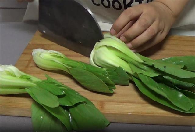 2.再把洗净的油菜对切一下。(www.ws46.cOm)