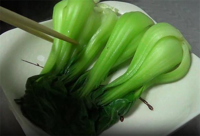 3.接着起锅烧水,加少量的盐和油,然后把油菜下锅焯水,再次煮开之后,两分钟就可以捞出了,捞出后可以直接摆在盘底。