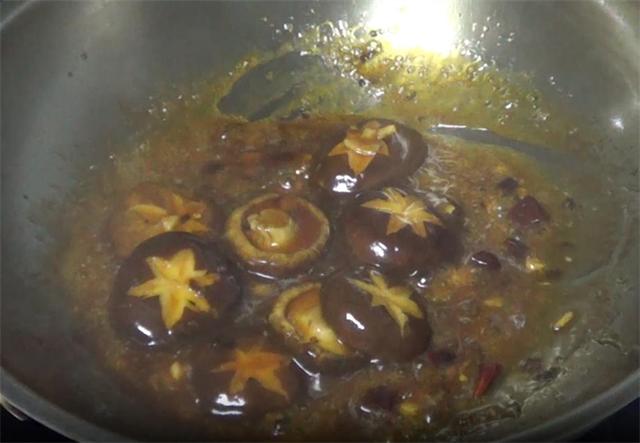 5.之后另起锅加适量的油,油热之后下入葱姜蒜末炒香,再加入干辣椒段,然后把香菇下锅翻炒,炒至油被吸干,倒入调好的芡汁,转小火把香菇煮熟,如果感觉汤少,可以加适量的水,等到汤汁浓稠就可以了。