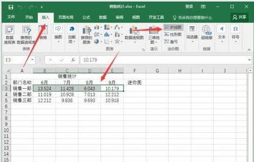 2、我们现在需要做的就是在F列做出B、C、D、E列中四组数据的迷你图。选中B3至E3单元格。打开“插入”菜单选项卡,而后点击“迷你图”功能区的“折线图”按钮选项。如图所示;
