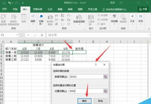 3、点击“折线图”按钮选项后,这个时候会打开“创建迷你图”对话框。在创建迷你图对话框中,可以看到鼠标光标已经定位到了“选择放置迷你图的位置”区域中“位置范围”内,我们选中F3单元格,在“位置范围”右侧的文本框中就会自动输入“$F$3”,而后再单击“确定”按钮。如图所示;