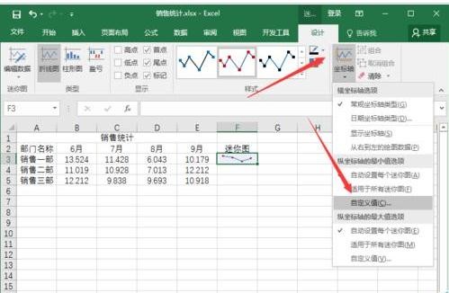 5、现在需要来修改迷你图的坐标轴格式。接着再点击“分组”功能区的“坐标轴”-->“纵坐标轴的最小值选项”下的“自定义值”命令选项。如图所示;