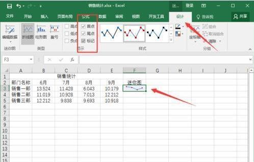 4、点击确定按钮后,在F3单元格内就已经插入了一个迷你图。并且自动切换到了“迷你图工具->设计”选项卡,在“显示”功能区中勾选“首点”“尾点”以及“标记”三个选项。如图所示;