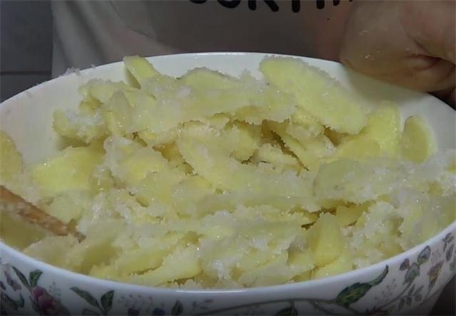 3.拌匀后封上保鲜膜,放入冰箱腌12个小时,这是腌好的姜。