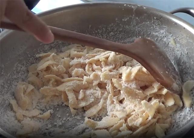 4.然后起锅,把姜和糖都倒入锅中,然后中火煮开,煮开之后转小火慢慢熬制,熬的时候糖会逐渐的变浓稠,糖分也会慢慢的重新凝固,一直到锅底的糖分泛白就可以关火了,然后利用余热不断的翻炒,炒到白糖凝固,姜片变硬就可以盛出了。