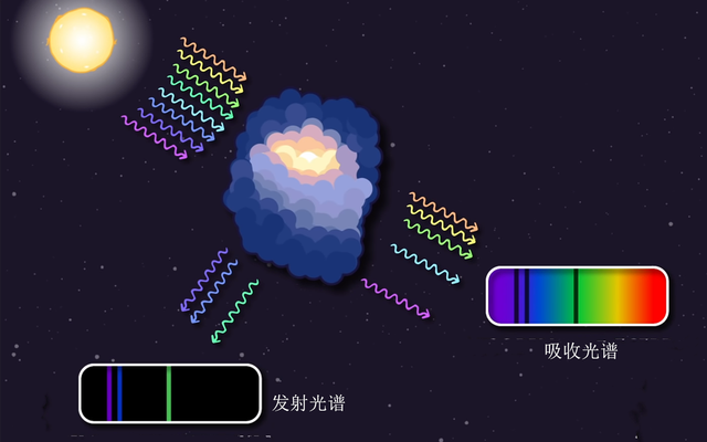有两种原子光谱:吸收光谱和发射光谱。吸收光谱是光源位于气体后面,气体吸收并散射某些波长的光,在恒星光谱中留下暗线。相反的是发射光谱,它是相同的过程,但从不同的角度看。