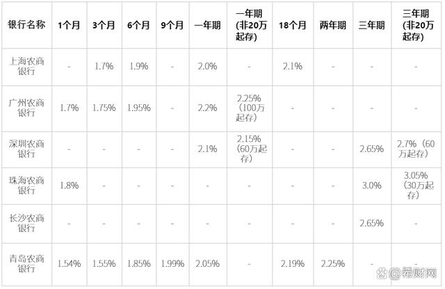 3、农商银行 上海农商银行:3个月利率1.7%;6个月利率1.9%;一年期利率2.0%;18个月利率2.1%。 广州农商银行:1个月利率1.7%;3个月利率1.75%;6个月利率1.95%;一年期利率2.2%;一年期利率(100万起存)2.25%。 深圳农商银行:一年期利率2.1%;三年期利率2.65%;一年期利率(60万起存)2.15%;三年期利率(60万起存)2.7%。 珠海农商银行:1个月利率1.8%;三年期利率3.0%;三年期利率(30万起存)3.05%。 长沙农商银行:三年期利率2.65%。 青岛农商银行:1个月利率1.54%;3个月利率1.55%;6个月利率1.85%;9个月利率1.99%;一年期利率2.05%;18个月利率2.19%;两年期利率2.25%。