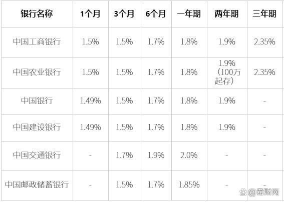 1、六大国有银行 中国工商银行:1个月利率1.5%;3个月利率1.5%;6个月利率1.7%;一年期利率1.8%;两年期利率1.9%;三年期利率2.35%。 中国农业银行:1个月利率1.5%;3个月利率1.5%;6个月利率1.7%;一年期利率1.8%;两年期利率1.9%(100万起存);三年期利率2.35%。 中国银行:1个月利率1.49%;3个月利率1.5%;6个月利率1.7%;一年期利率1.8%;两年期利率1.9%。 中国建设银行:1个月利率1.49%;3个月利率1.5%;6个月利率1.7%;一年期利率1.8%;两年期利率1.9%。 中国交通银行:3个月利率1.7%;6个月利率1.9%;一年期利率2.0%。 中国邮政储蓄银行:3个月利率1.5%;6个月利率1.7%;一年期利率1.85%。