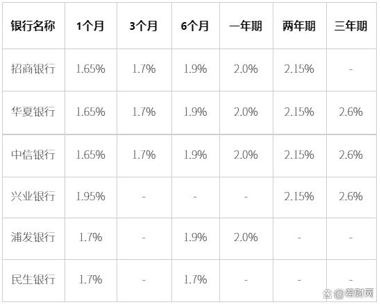 2、六大商业银行 招商银行:1个月利率1.65%;3个月利率1.7%;6个月利率1.9%;一年期利率2.0%;两年期利率2.15%。 华夏银行:1个月利率1.65%,3个月利率1.7%,6个月利率1.9%,一年期利率2.0%,两年期利率2.15%,三年期利率2.6%。 中信银行:1个月利率1.65%;3个月利率1.7%;6个月利率1.9%;一年期利率2.0%;两年期利率2.15%;三年期利率2.6%。 兴业银行:1个月利率1.95%;两年期利率2.15%;三年期利率2.6%。来源: www.ws46.com 浦发银行:1个月利率1.7%;6个月利率1.9%;一年期利率2.0%。 民生银行:1个月利率1.7%;6个月利率1.7%。