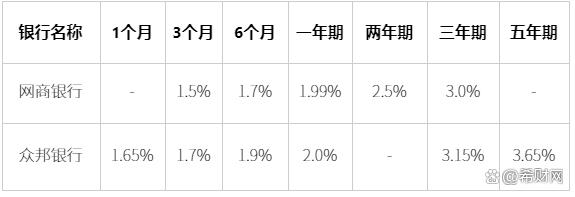 4、民营银行 网商银行:3个月利率1.5%;6个月利率1.7%;一年期利率1.99%;两年期利率2.5%;三年期利率3.0%。 众邦银行:1个月利率1.65%;3个月利率1.7%;6个月利率1.9%;一年期利率2.0%;三年期利率3.15%;五年期利率3.65%。