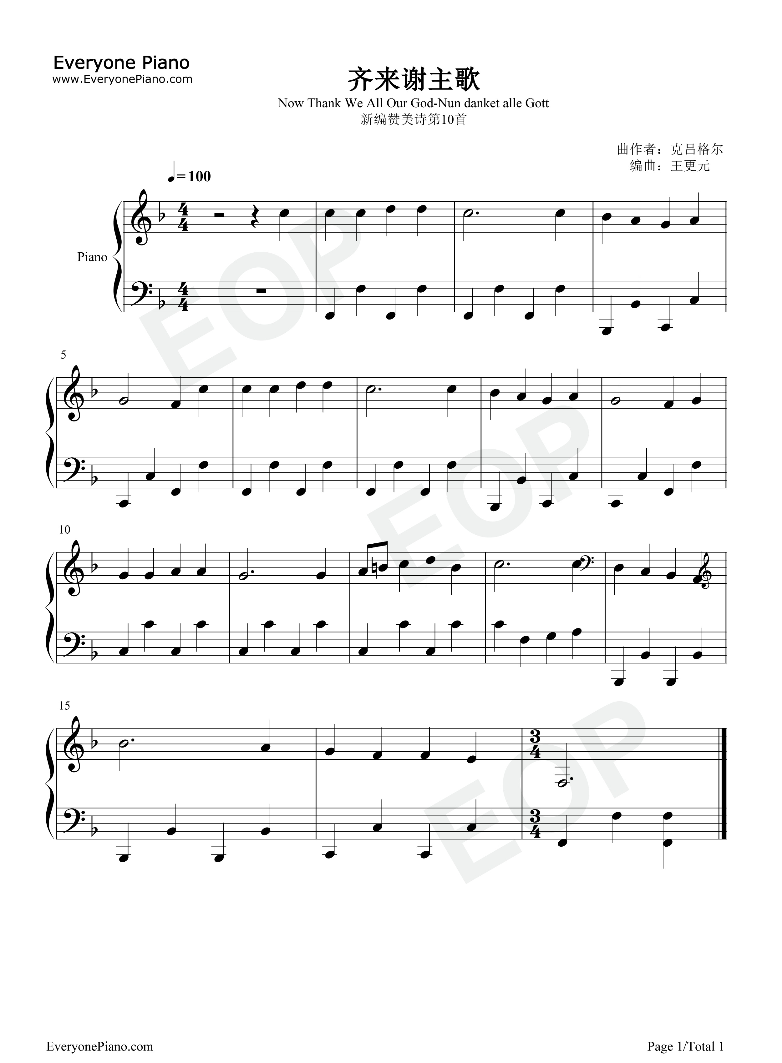 ,英文Now Thank We All Our God,德语Nun danket alle Gott,由牧师Martin Rinkart于1636年所写,而旋律由Johann Crüger创作。 这首赞美诗虽然是在1636年左右写的,但一直到了1663年才出版。这首赞美诗前两节歌词的灵感来自于次经西拉书50:22-24,“Now bless the God of all, who in every way does great things.”(现在上帝保佑,所有正在做伟大事情的人)。第三段歌词,来自于一段四世纪写于希腊的荣耀颂,用人认为更早,在公元95年就创作了。 在很多场合可以使用这首赞美诗,不仅仅在感恩侍奉的时候。最常见的是,在崇拜结束时或回应感恩祈祷时使用。也可以在奉献的过程中演唱,可以感谢上帝的祝福。这首赞美诗非常适合教孩子们演唱。 齐来谢主歌双手简谱是网友提供的,由网友制作,感谢王更元KURZWEIL对EOP的支持! 齐来谢主歌歌词: Now thank we all our god with heart and hands and voices Who wondrous things has done in Whom this world rejoices Who from our mothers" arms has blessed us on our way With countless gifts of love and still is ours today O may this bounteous god through all our life be near us With ever joyful hearts and blessed peace to cheer us And keep us in His grace and guide us when perplexed And free us from all ills in this world and the next All praise and thanks to god the Father now be given The Son and Him Who reigns with Them in highest Heaven The one eternal god whom earth and Heaven adore For thus it was is now and shall be evermore |