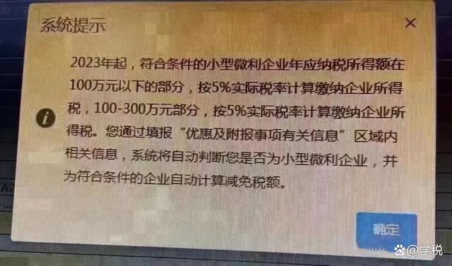 据部分地方税务局的申报系统弹出的最新提示,2023年开始,符合条件的小型微利企业年应纳税所得额不超100万部分,按5%实际税率计算缴纳企业所得税,也就是税负率实际5%。
