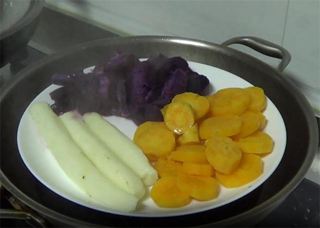 2.我们先把紫薯和红薯都切成块,切好了之后装盘,然后放入锅中,先把三种食材蒸熟,大概20分钟就蒸熟了。