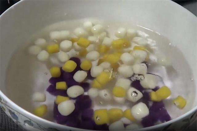 7.接着起锅烧水,水开之后下入芋圆,不同颜色的要分开煮,防止串色,芋圆浮起来就熟了,三种都煮好之后,要放入冷水中。