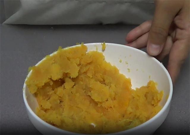 3.要趁热把三种食材都碾碎,这里以红薯为例。