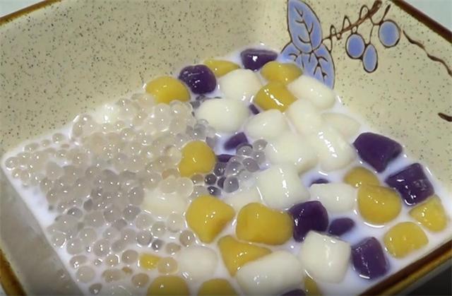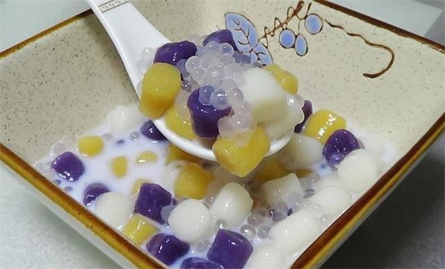 9.然后把芋圆放入碗中,再加入西米,根据喜好再倒入牛奶或者椰奶,还可以添加喜欢的水果,这样一碗好吃的三色芋圆就做好了,Q弹爽滑,适合家中自己做,喜欢的朋友可以试一试。 |
