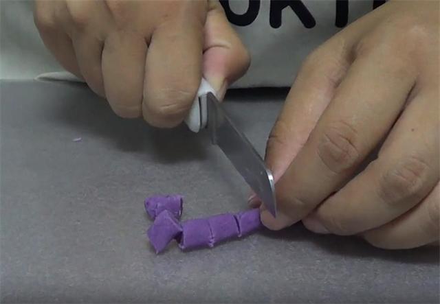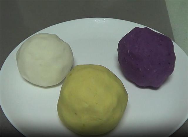 5.这样把三种都做好,然后每种取少部分揉成长条,再用刀切成小块。