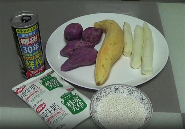 准备食材: 红薯、紫薯、山药、西米、椰奶、牛奶 具体做法: