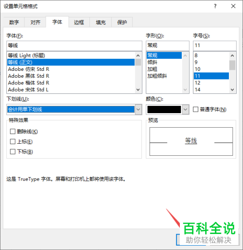 6. 第六步,在下图所示的弹出窗口中,点击箭头所指的会计用单下划线选项。