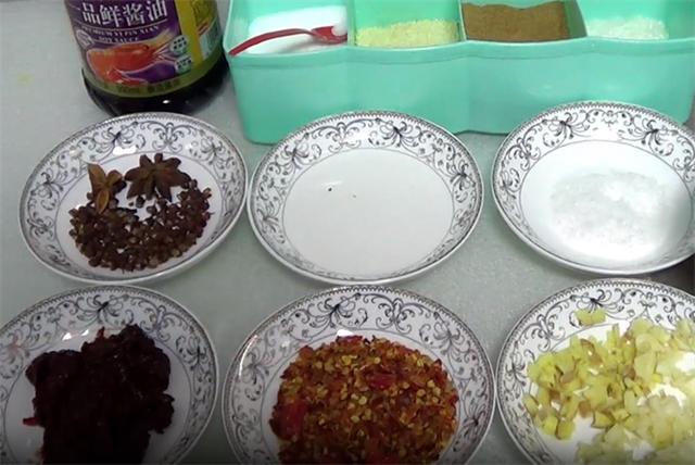 2.下面看一下我们准备的辅料,包括姜蒜末、辣椒粉、郫县豆瓣酱、花椒、八角、水淀粉、白糖、酱油、盐、味精、十三香。