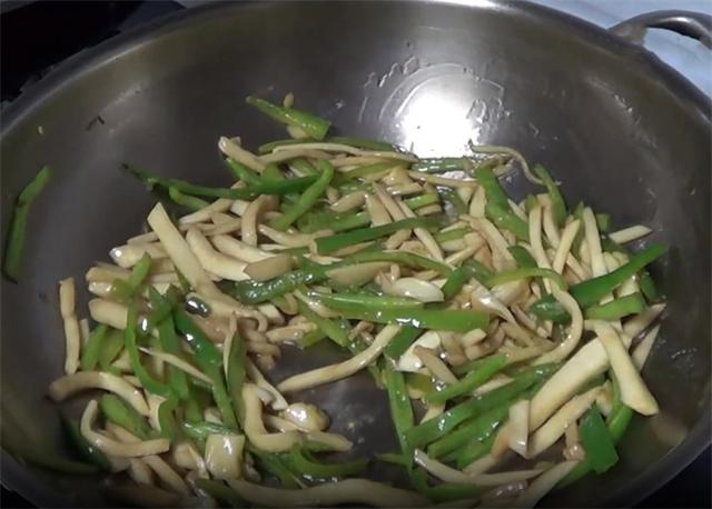 3.接着下入杏鲍菇,把杏鲍菇炒至变软,然后加少量的酱油调味,再加适量的盐,炒匀就可以出锅了。