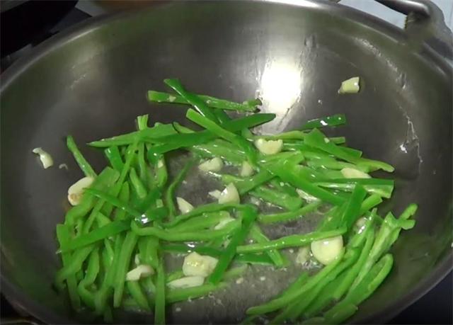 2.接着起锅加适量的油,油热后下入大蒜炒香,然后再下入青椒,快速的炒至断生,青椒炒的时间不要太久。
