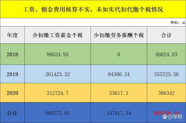 公司通过上述违法手段,共造成少交增值税16万余元,城建税1.1万余元,企业所得税87万余元。 与此同时,税务局在检查中还发现,该公司还存在工资、佣金费用核算不实,未如实代扣代缴个税的情况。 主要操作手段就是隐瞒了员工人数,并用公司法定代表人杨某某的私人银行账户(也是收取营业款的账户)给部分员工发放工资和支付佣金费用。 公司并没有按规定对私户发放的工资薪金和佣金费用进行核算,也没有按照规定代扣代缴个税。经检查,2018年至2020年期间,公司共计少扣缴个税80余万元,具体少扣缴个税情况如下表所示: