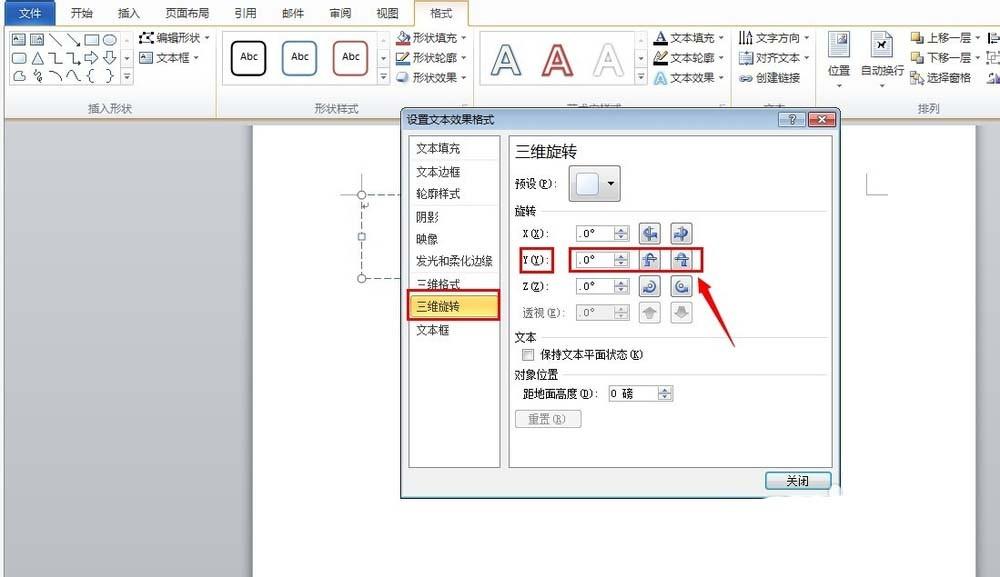 5、在打开的艺术字样式选项中找到三维旋转,然后将Y轴的角度改为180度,也就是说文字在Y轴上旋转180度。
