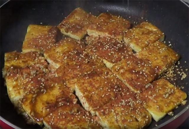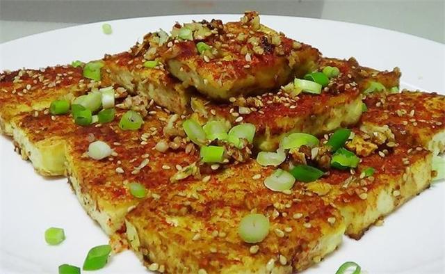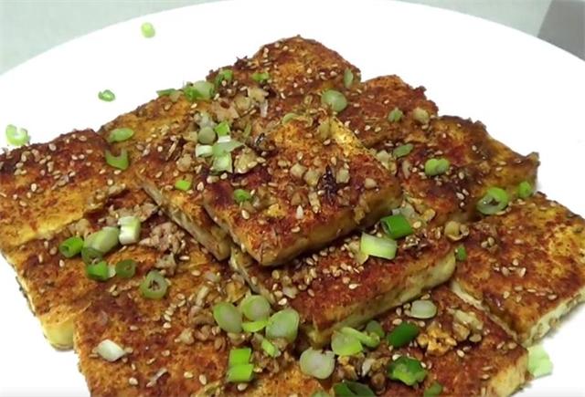 准备食材: 老豆腐、烧烤酱、蒜末、孜然粉、辣椒面、白芝麻、食用油、葱花 具体做法:(www.ws46.com)