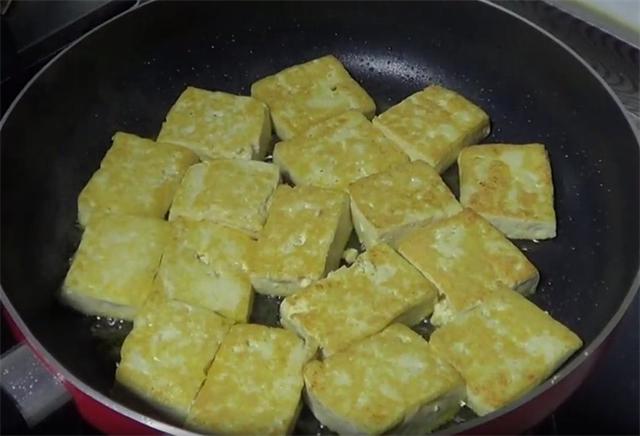 3.做这个最好是用平底锅,容易做不粘,用少量的油就可以,油热之后把豆腐均匀的铺上去,慢慢的煎制,一面煎至金黄之后翻面,两面都煎至金黄再次翻面。