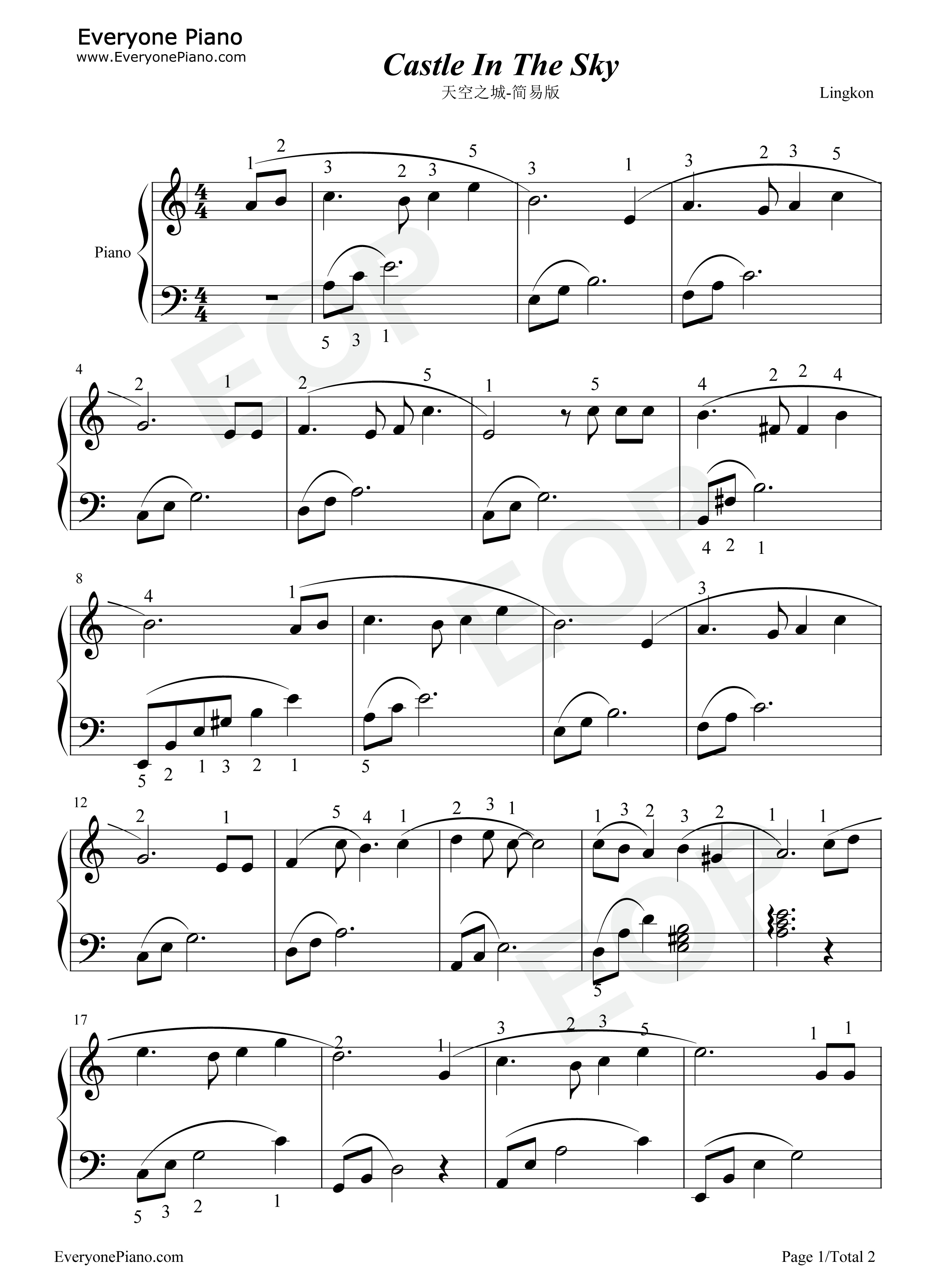 虽然《天空之城超简单版本》的谱子网络上很多,但这个版本为超级简单版本,还是C调,和弦简单无比,是EOP新手入门的必学之作。 该版本伴奏文件由制作提供官网,感谢占富尧老师对EOP的支持! 《天空之城》(天空の城ラピュタ)是日本吉卜力工作室于1986年推出的一部动画电影。《天空之城》的原作、监督、脚本和角色设定都是由宫崎骏来担任,使得这部作品充满了宫崎骏的理念。出现在《天空之城》中的空中城堡拉普达(Laputa)一般被认为是来自于英国作家乔纳森·斯威夫特的知名小说《格列佛游记》中的飞岛国。后因此开发出同名网游。 《天空之城》主题曲《伴随着你》(通称:天空之城)由音乐家久石让作曲,因以其让人落泪的优美曲调和动人心弦的美妙音律而闻名全球,被改编成多种版本,成为经典的轻音乐名曲,也成为流芳百世的世界名曲。 |