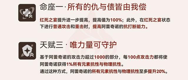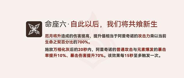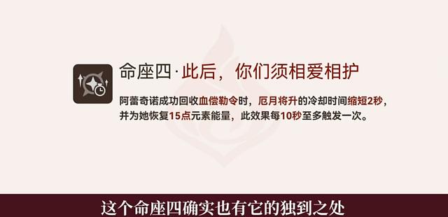再来看看四命,这个四命还是有它的独到之处的。 阿蕾奇诺在回收血偿勒令的时候还能减少其冷却时间。 在回收能量的同时能更频繁去使用元素爆发。 相较于二命,这个四命的效果我是一般推荐的,有条件的可以试试!