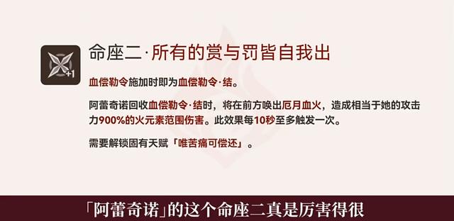 接着再来说说仆人的二命,仆人这个二命可真是厉害得很。 首先是加强了血偿勒令释放时的效果,其次提升了仆人的对单能力。 最后在重击回收血偿勒令的时候还能造成900%的火元素伤害。 考虑实战中会出现的各种元素反应,比如蒸发、绽放等,实际伤害只会更高。 这个二命如果有条件的话,我是强烈推荐的!