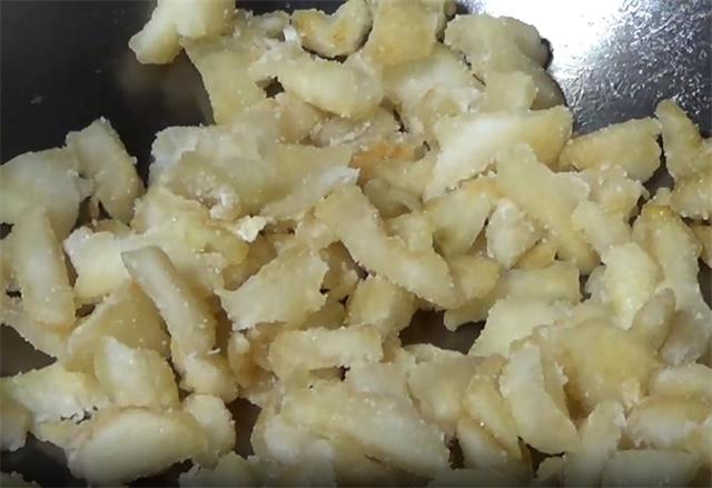 8.最后就是小火不断的翻炒,炒的时候可以适当的挤压,把水分尽可能的排出来,炒的时间比较长,所以一定要耐心一些,等炒至柚子瓤变透明或者是半透明,表层起沙就可以了。