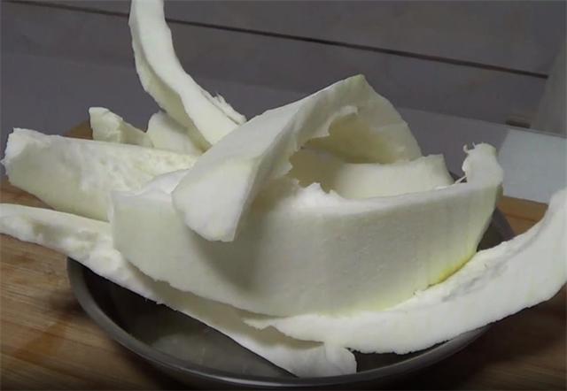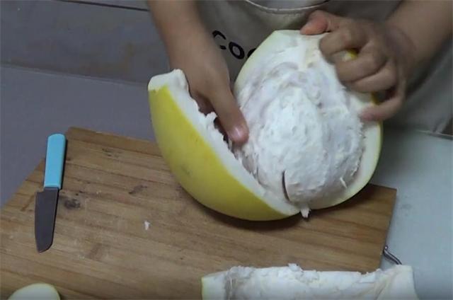 2.柚子皮扒下来之后,我们再用刀把表皮剔除,表皮留着做别的。