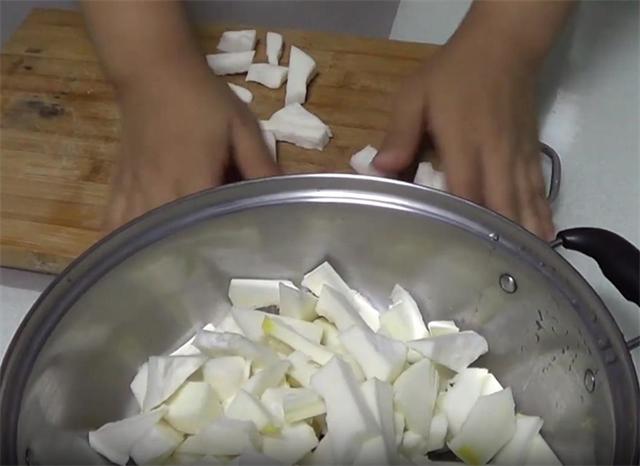 3.然后再把柚子瓤切成小块,切好之后,我们用清水多冲洗几次,这样可以去除苦味。